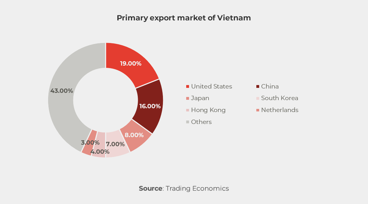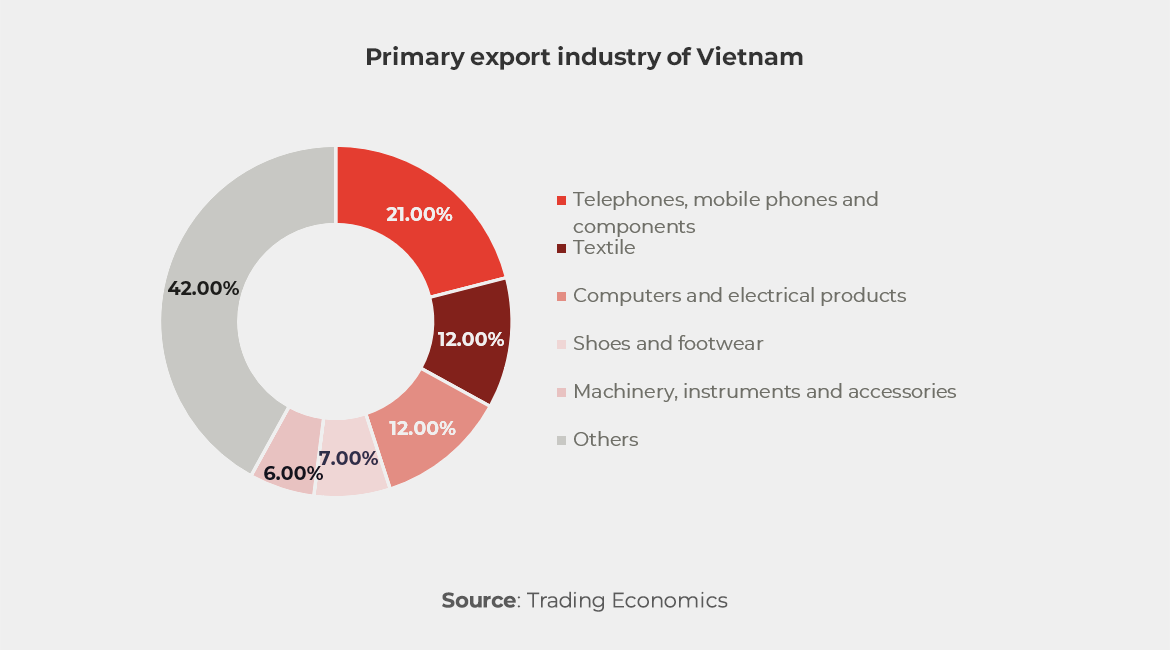 Key export categories include telephones, mobile phones, and components, as well as textiles, footwear, and wood products. Vietnam’s primary export markets are the United States, China, and Japan while China is our largest import country.