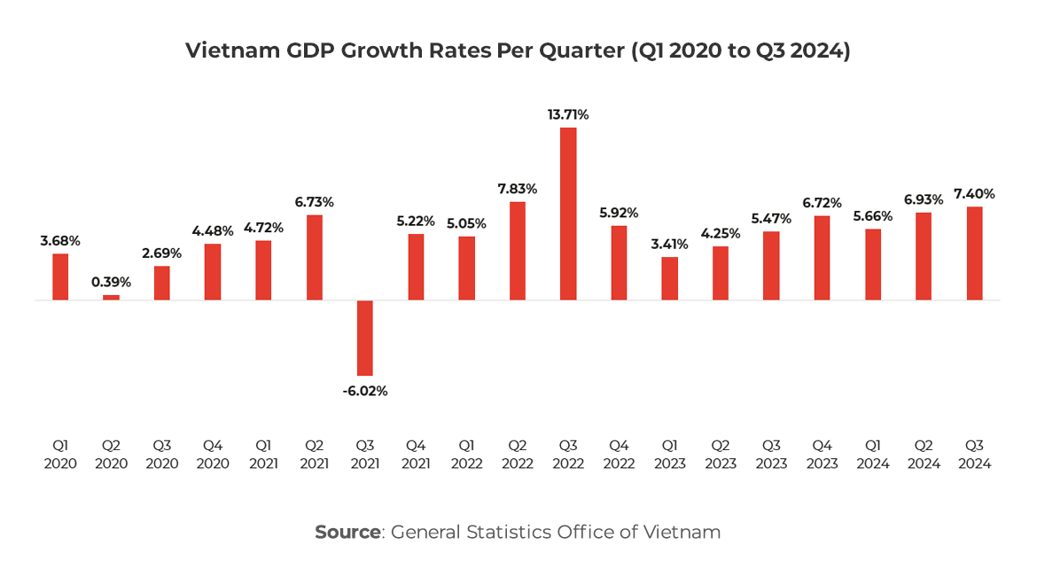 - Q3 2024 Vietnam’s GDP rose 7.4%, driven by industry, construction, and services.
