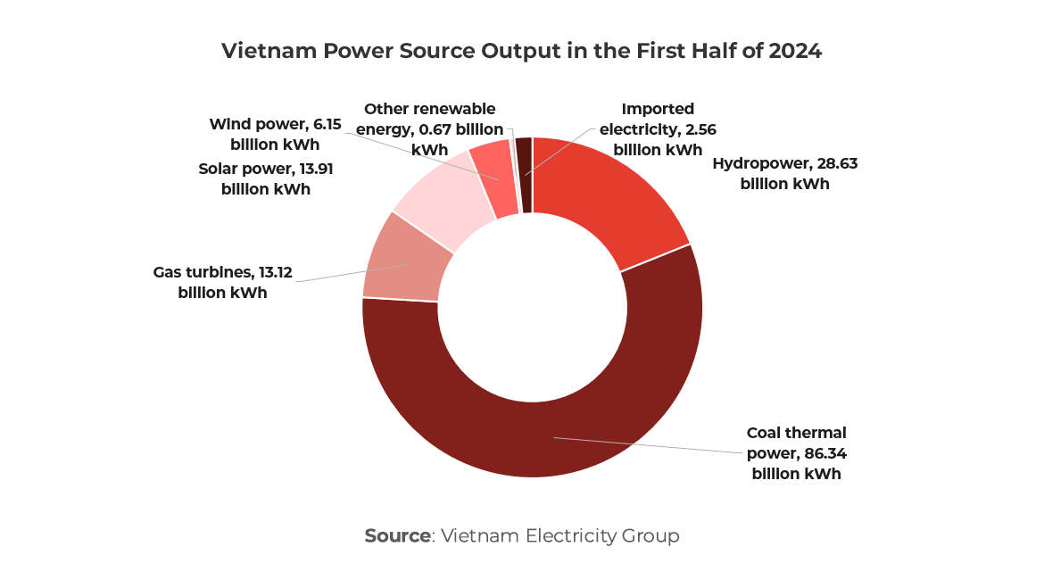 During the first half of 2024, Vietnam produced 13.91 billion kWh of solar energy and 6.15 billion kWh from wind, together representing 13.3% of the nation’s total electricity output. In total, renewable energy sources generated 49.36 billion kWh, contributing 32.6% of the overall energy mix. Despite this growth, coal-fired power remained the dominant energy source, accounting for 57.0% of the country’s total energy production. Renewable energy has made significant progress toward Vietnam’s long-term renewable energy targets. Although the current figure of 32.6% for renewable energy indicates consistent growth, achieving the upper end of the national target (39.2% by 2030) will require further acceleration in infrastructure development, regulatory reform, and increased domestic and foreign investment, particularly in wind and solar sectors.