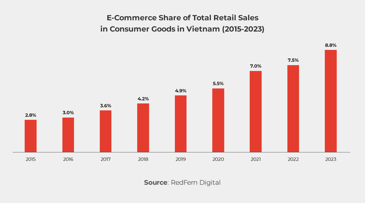 Vietnam’s e-commerce sector has been a major driver of this growth. From just 2.8% of total retail sales in 2015, e-commerce accounted for 8.8% as of 2023. In 2023 alone, 57 million Vietnamese consumers made online purchases, with the majority concentrated in major cities like Ho Chi Minh City, Hanoi, and Da Nang City.