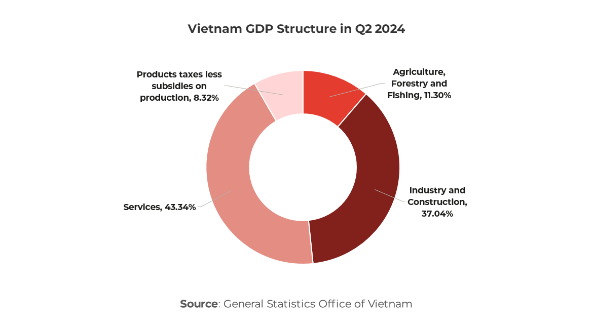 Breaking down the sector contributions in Q2 2024, the service sector accounted for the largest portion at 43.34% of the total, followed by industry and construction at 37.04%. Additionally, the agriculture, forestry, and the fishing sector contributed 11.30% of GDP. This distribution demonstrated the continued dominance of services and industry as the main drivers of Vietnam’s economic growth during this period.