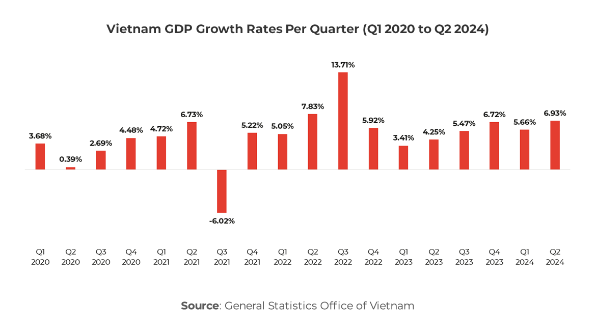 Vietnam’s GDP growth surged to 6.93% year-on-year in Q2 2024, representing the strongest expansion since Q3 2022 and the 11th consecutive quarter of growth.