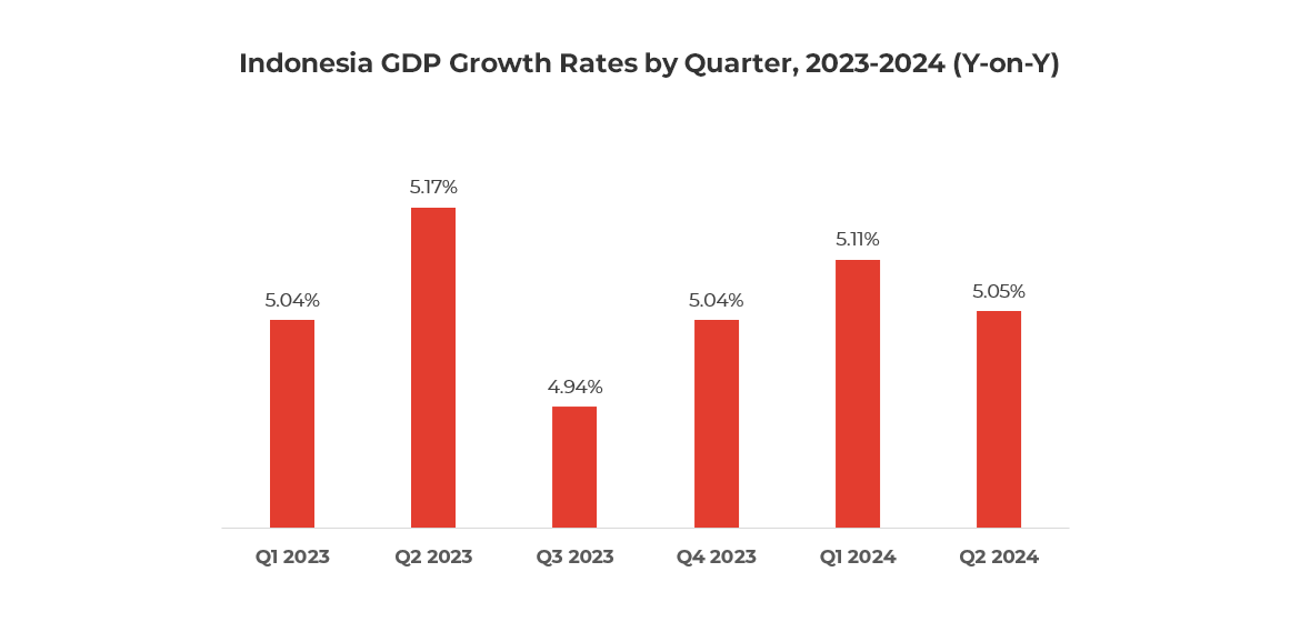 In the second quarter of 2024, Indonesia’s economy displayed resilience, achieving a year-on-year (YoY) GDP growth of 5.05%, slightly lower than the 5.1% seen in the first quarter.