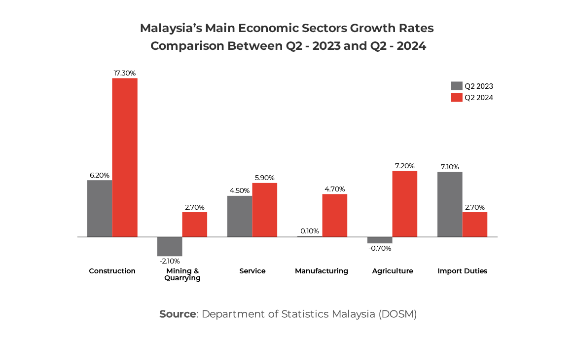 - Agriculture Sector: The agriculture sector showed remarkable growth of 7.2% year-on-year in Q2 2024, a substantial rise from 1.7% in the previous quarter and a recovery from a contraction of -0.7% in the same period last year. This surge was largely driven by strong performance in palm oil production and livestock farming