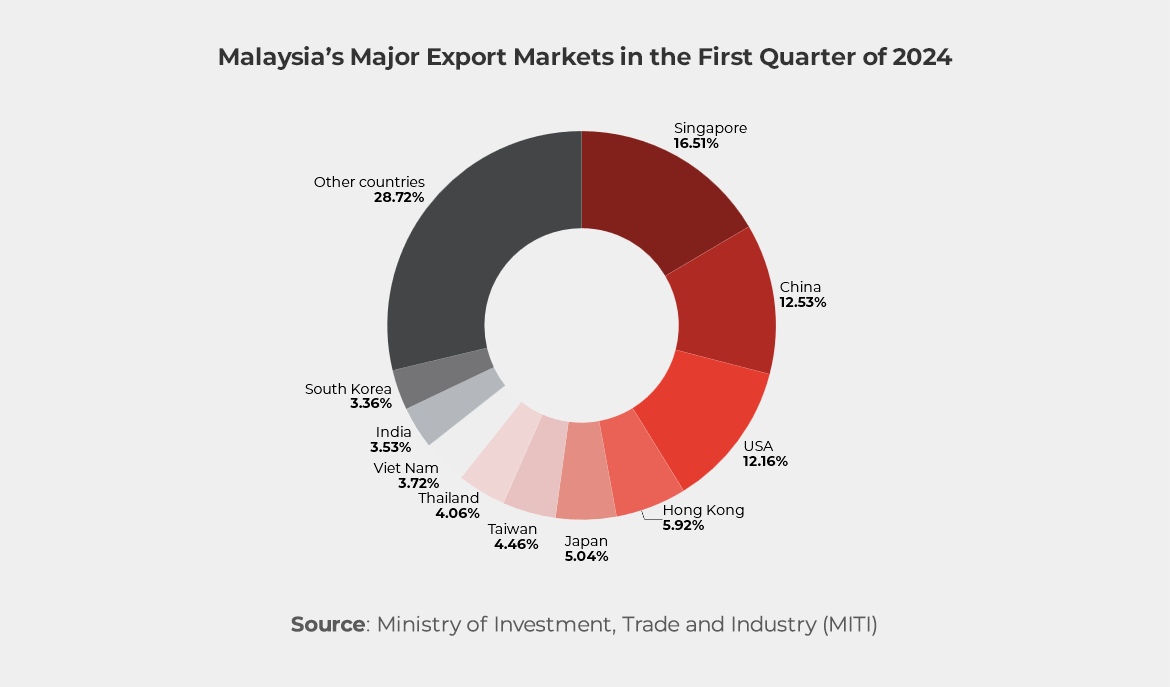 Exports during this period reached RM368.78 billion, reflecting a 1.8% increase quarter-on-quarter and a 5.8% rise year-on-year. Malaysia’s primary export products included Electrical and Electronic Products, Petroleum Products, and Palm Oil and Palm Oil-Based Agricultural Products. Noteworthy year-on-year growth was observed in the export of Machinery, Equipment, and Parts, which increased by 22.8%, Palm Oil-Based Manufactured Products, which rose by 17.1%, and Optical and Scientific Equipment, which grew by 13.8%. The top three export markets for Malaysia during this quarter were Singapore, China, and the United States.
