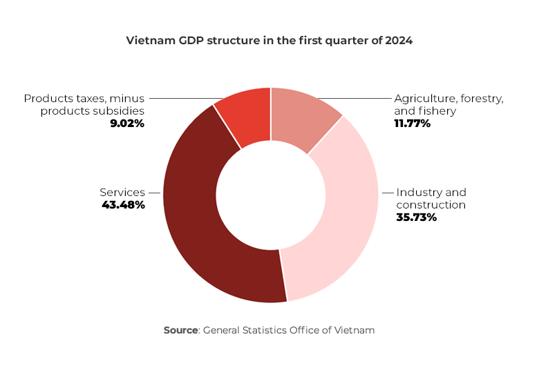 Focus on promoting tourism and trade resulted in a 6.12% expansion of the service sector in the first quarter. Due to this growth, the service sector now comprises over 52.2% of Vietnam’s GDP growth. The agriculture, forestry, and fishery sectors are showing signs of recovery, though at a more moderate pace with a growth rate of 2.98%.