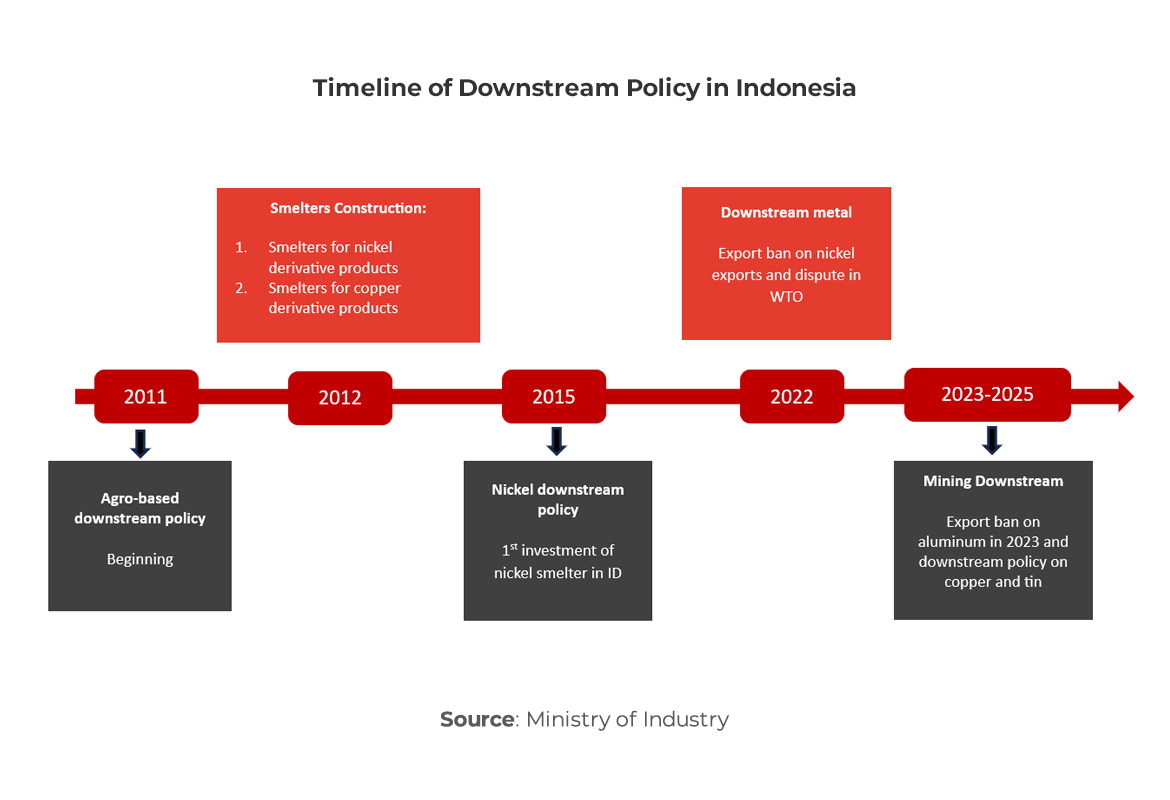 In 2010, Indonesia initiated downstream industry development across agro-based, mineral mining-based, and oil and gas sectors. This policy gained global attention, especially in the nickel sector due to high demand for EV batteries. Malaysia has since adopted a similar approach for inorganic chemicals, while the Philippines is considering it.
