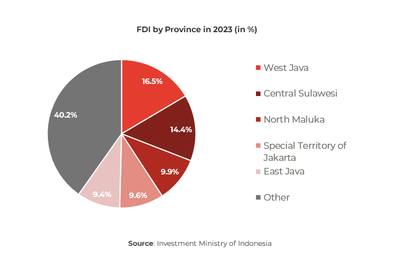 Indonesia’s strong existing trade frameworks with neighboring economies and other East Asian economies have helped attract FDI as the key investors are Singapore, China, SAR Hong Kong, Japan, and Malaysia, combined all accounting for 80% of realized FDI inflow in 2023. FDI was concentrated in only 5 of Indonesia’s 38 provinces, – West Java, Special Territory of Jakarta, East Java (all on main island Java), Central Sulawesi, and North Maluka, alone received 59.8% of all FDI. Java’s 6 provinces alone received 48.5% of the total FDI inflows in 2023.