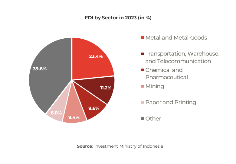 In 2023, metal and metal goods continued to dominate foreign investment interest, attracting 23.4% of total FDI, maintaining a growth trajectory similar to 2022. Following closely, transportation, warehousing, and telecommunication secured the second position with 11.2% of total FDI. When combined with chemical and pharmaceutical, mining, and paper and printing, these top five sectors collectively accounted for 60.4% of Indonesia’s FDI inflows in 2023.