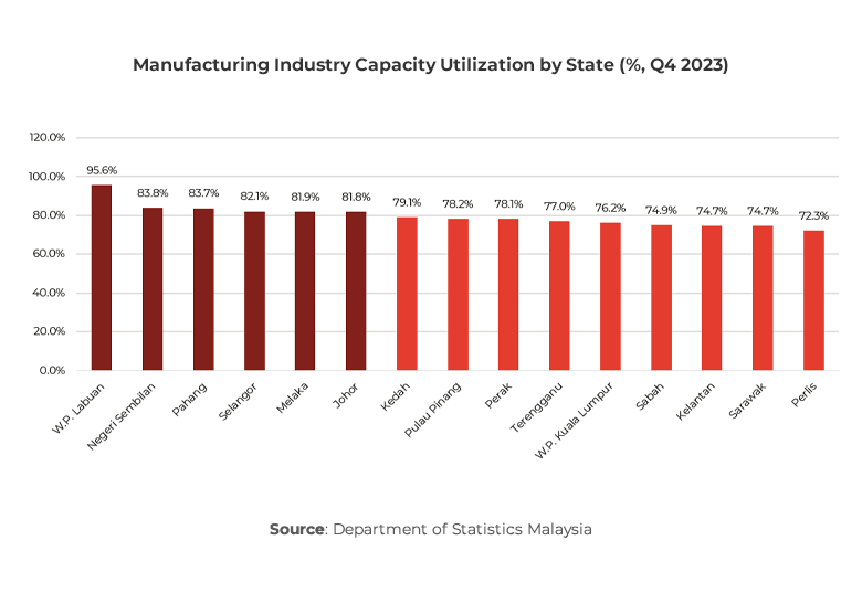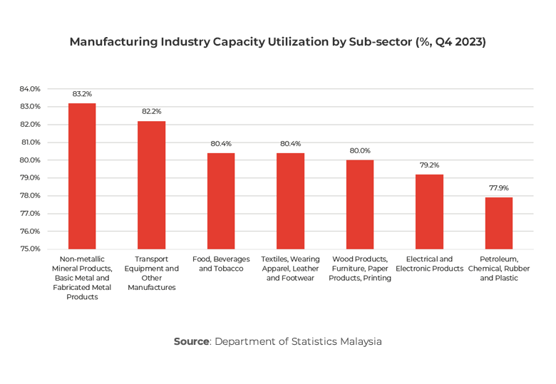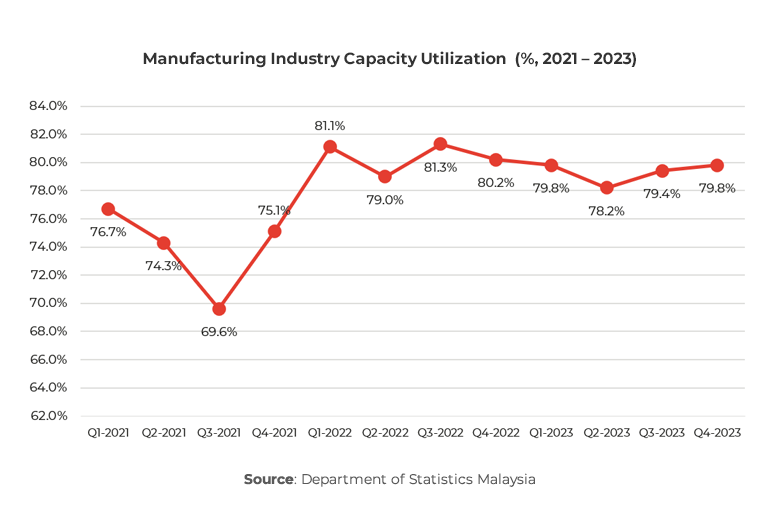 In Q4 2023, Malaysia’s manufacturing sector’s capacity utilization decreased to 79.8%. Specific sub-sectors, such as petroleum, chemical, rubber, and plastic products, experienced significant declines, while others, like non-metallic mineral products, basic metals, and fabricated metal products, reached peak performance.