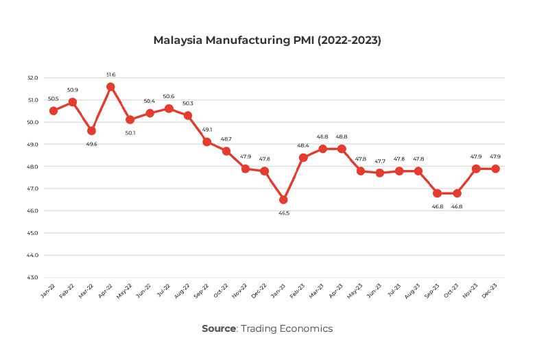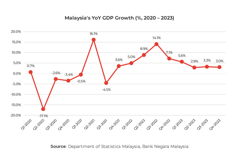 In Q4 2023, Malaysia’s economy expanded by 3% YoY, sustaining its growth trend but slipping from 3.3% in the preceding quarter. The central bank attributed this slowdown to a demanding external landscape, pointing to slower global trade, geopolitical tensions, tighter monetary policies, and a global tech downturn.