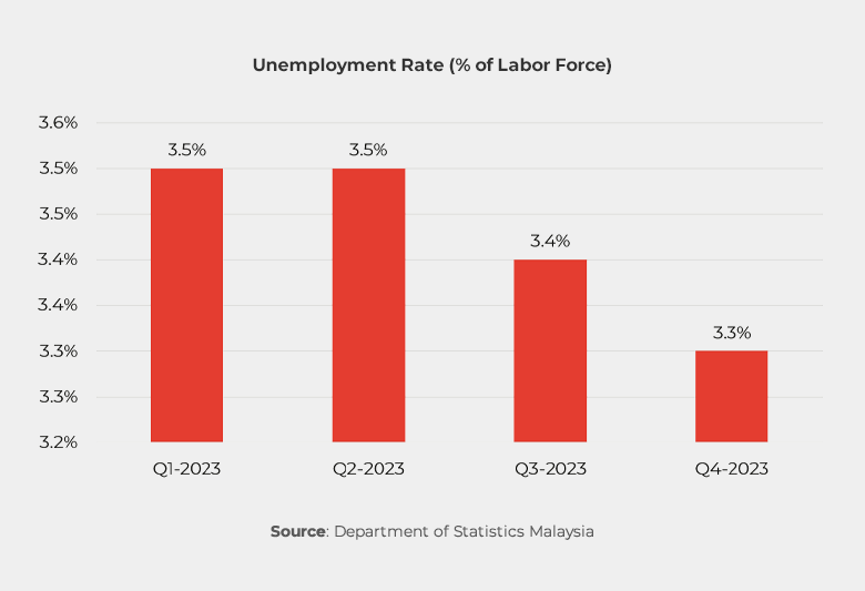 Malaysia in Q4 2023 saw a robust labor market performance, indicating encouraging economic activity. The number of employed individuals continued to climb, signaling positive trends, while unemployment rates showed a decline. The labor force expanded slightly by 0.1%, reaching a total of 16.97 million people, with a labor force participation rate of 70.1%. The stable labor market outlook is primarily upheld by domestic demand, reinforced by the resurgence of tourism activities, continuous foreign direct investment (FDI) inflows, the potential turnaround in international trade, ongoing infrastructure projects, all contributing to the maintenance of job opportunities.
