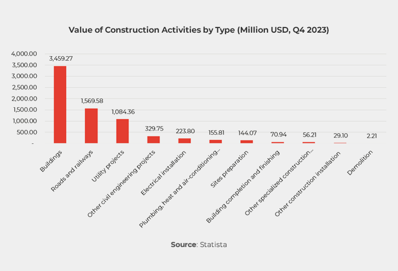 41.9% of the construction sector’s work done value was attributed to civil engineering. This segment was predominantly led by the construction of roads and railways, accounting for USD 1.6 billion, and utility projects, contributing USD 1.1 billion. On the other hand, special trade activities, contributing 9.6% to the total value, were primarily driven by electrical installation, plumbing, heating, and air-conditioning installation, and site preparation activities.
