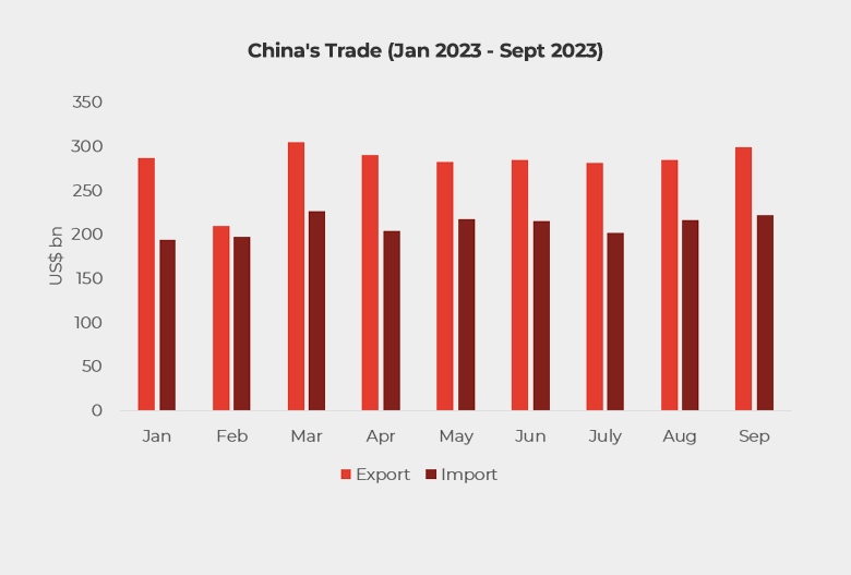 In September 2023, the total value of exports declined by 6.2% YoY. China’s imports also decreased by 6.2% compared to 2022.