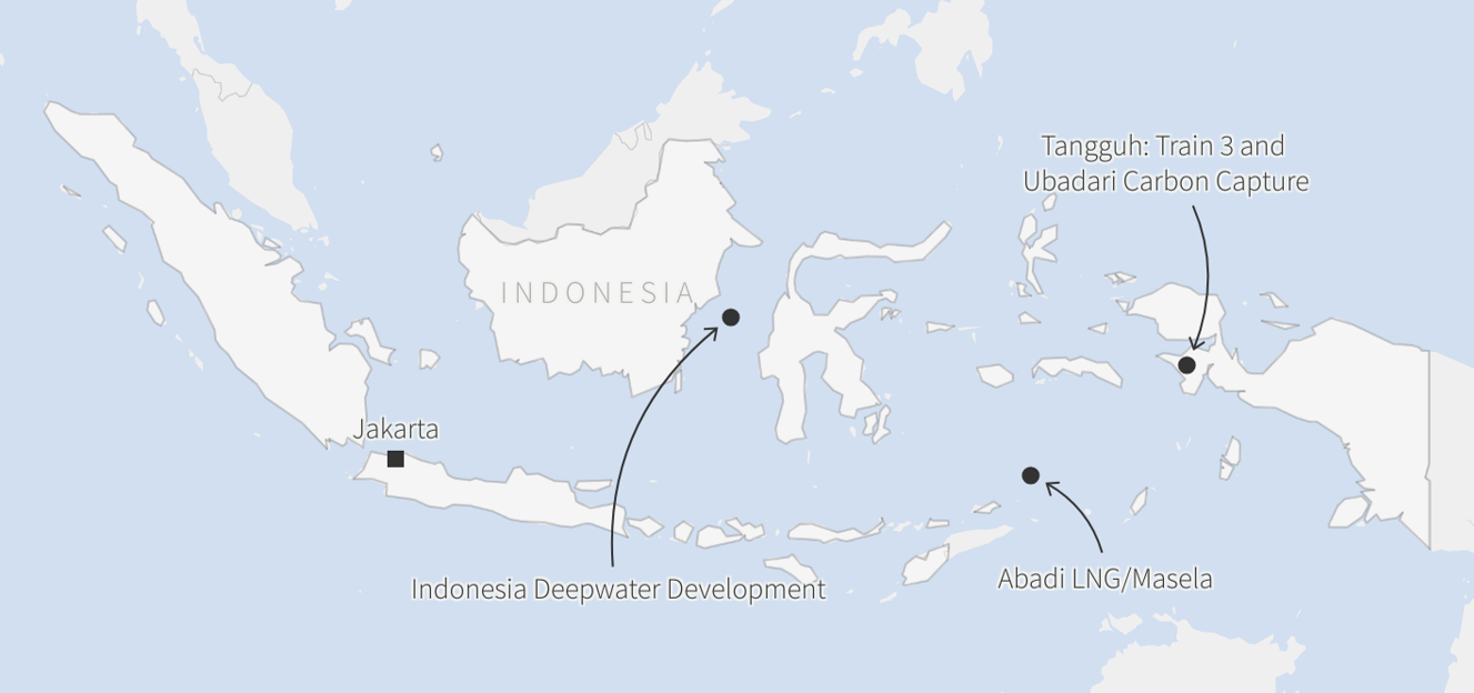 Located in the Makassar Strait off the island of Borneo, IDD owns nearly 3 trillion cubic feet of recoverable gas resources and the deepest offshore gas fields at water depths of up to 6,000 feet. The Masela gas project, located off the Tanimbar islands in Maluku, is expected to have production capacity of 9.5 million metric tons per annum at its peak.