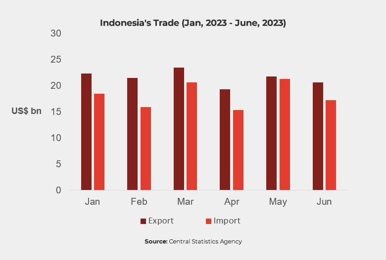 In June, Indonesia’s import value was $16.69 billion (up 10.71% YoY), while the export value was only $15.36 billion (down 16.44% YoY). According to Indonesia’s Central statistics agency, the trade deficit of $1.33 billion was largely due to a sharp decline in the value of oil and gas trade.