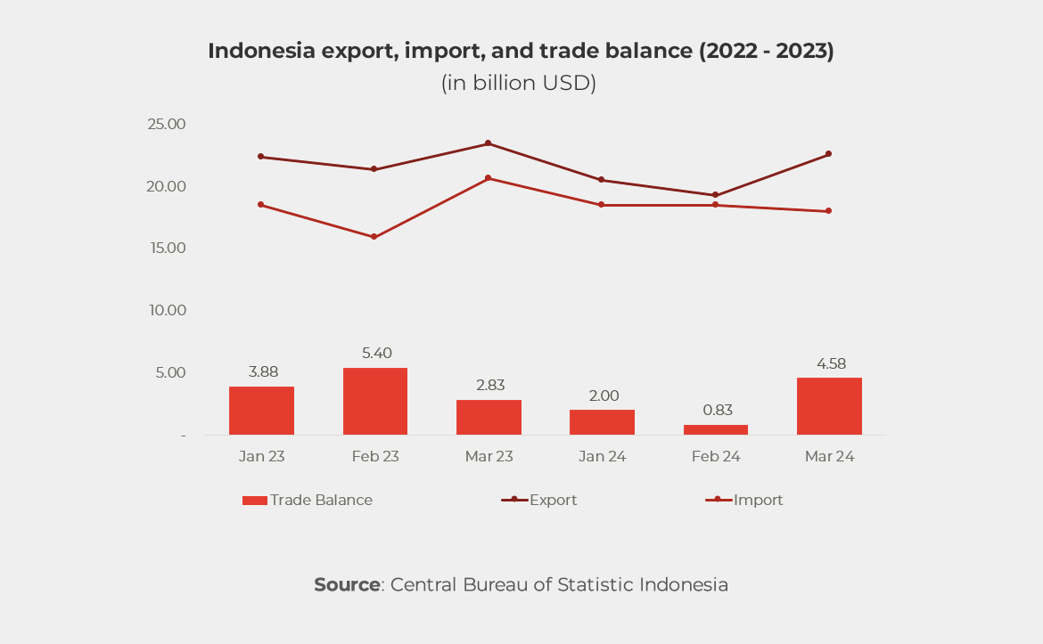During the first quarter, the country could still maintain the positive trend of its trade surplus with a total value of USD 7.41 billion. This achievement meant that Indonesia has recorded a trade surplus for 47 consecutive months since May 2020, and should the country extend its performance to April, the government will match the longest surplus record from the late 70s to early 80s. Regardless, the exports from Indonesia experienced a slight decline, so the trade surplus has narrowed. The export component contributes 21.37% to Indonesia’s economic growth structure.